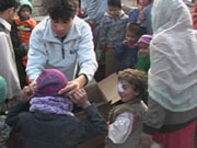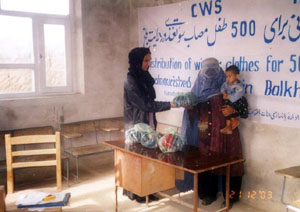 While we came close to the 5,000 mark for wool garments, we did not quite reach that number. The load was supplemented with additional blankets and other items. Our relief agency partner (an Afghan organization that works with Church World Service) distributed the garments in sets of 10 to each mother for her family -- 500 families in total. These families have many children of young ages. These families live in Mazar City, Alburz, Nehr-e-Shahi, and Khulam districts of the Balkh Province in the north. We depend on the relief agency for their expertise on how best to distribute our gifts. The plastic bags being handed to the mothers are filled with our knitted and crocheted gifts. | ![]() |