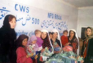 Photo notes: The distributions described above were in addition to our other shipments of blankets and garments to displaced Afghan families since late 2001. You are warming children, women, and men. Your handmade gifts send a strong message of caring and respect to the people of this devastated country that's striving to rebuild. Our Partner, American Friends Service Committee With all our shipments, the American Friends Service Committee in San Francisco generously provides in-take on mail, storage services, and coordination assistance. |