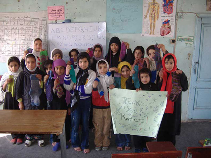 Thank You, Knitters and Crocheters, for Afghanistan! March 2007, Marsha MacColl delivered our wool socks to students at two schools in Kabul run by Afghans 4 Tomorrow. Marsha is on the board of Afghans 4 Tomorrow. Keep in mind that Afghans customarily remove shoes when inside, and heating fuel is precious. Marsha says the children loved their socks! What a wonderful thank you message! See more photos from Afghanistan!